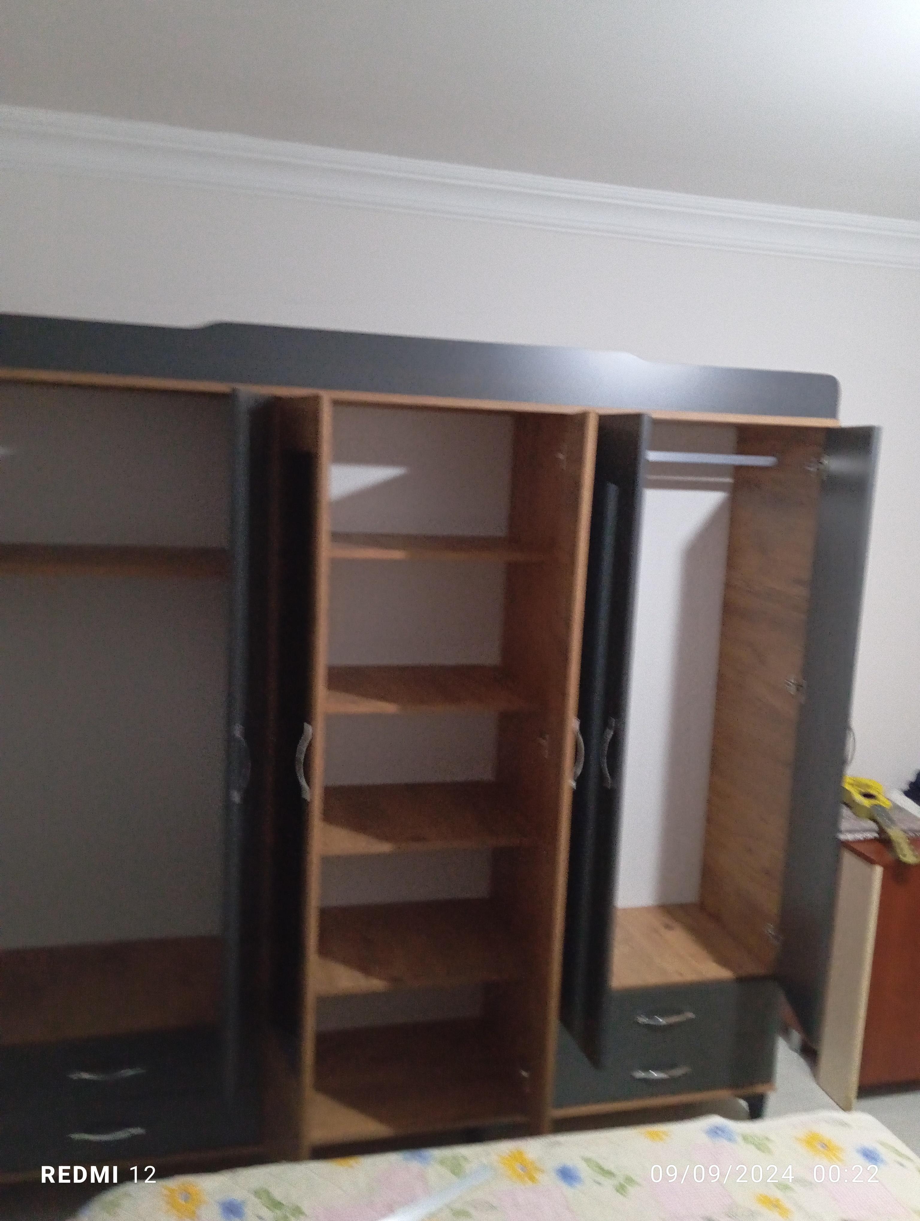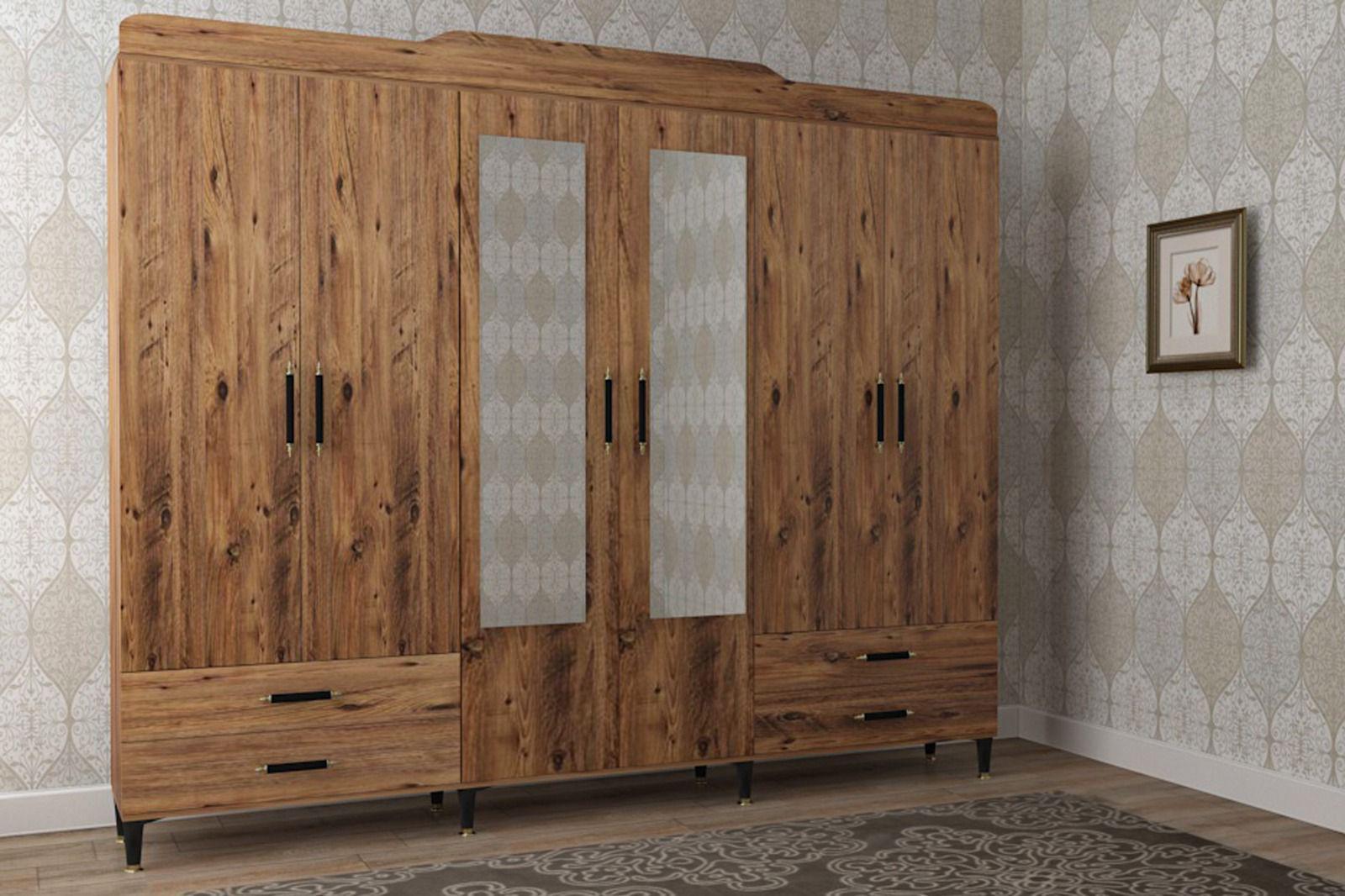 Ürünümüz son model tarz antrasit ve çam renklerde kombinasyonla imal edilmiştir 6 kapılıdır orta kısım raf kısmı yanlarda iki tane askı bölümü en altta sağ ve sollarda 4 çekmece vardır iki aynası vardır 2.40 x 2.20 ölçülerindedir ayakları yüksektir altına süpürge girebilir