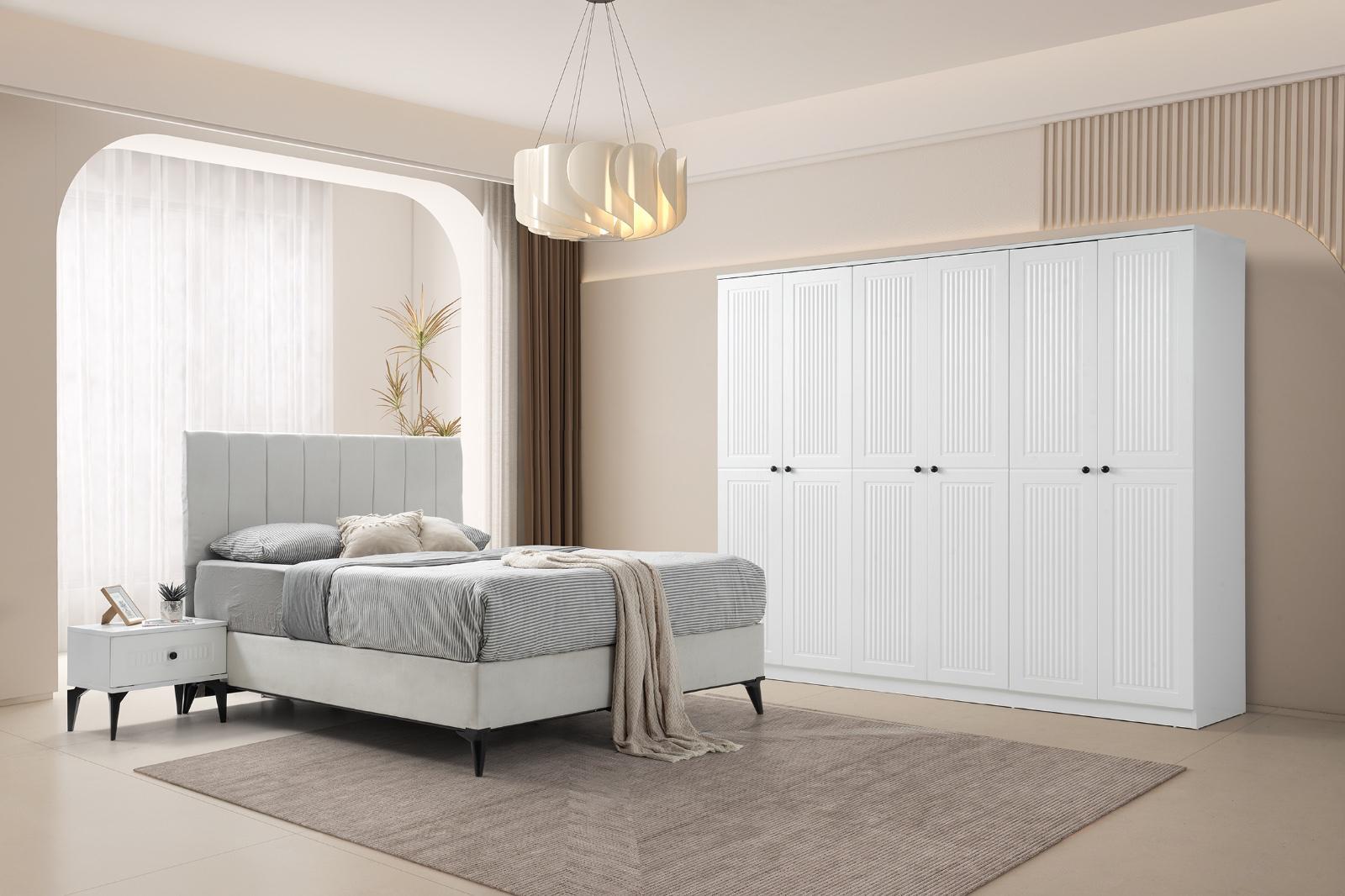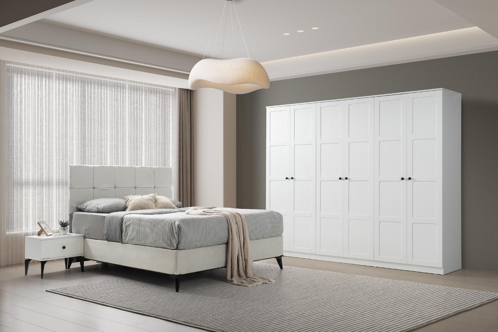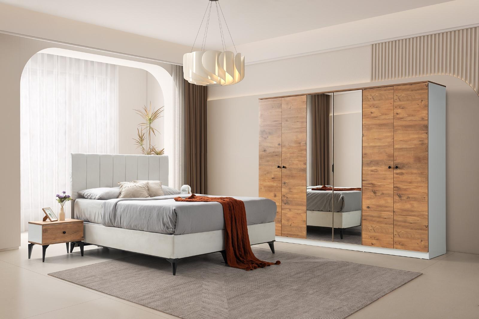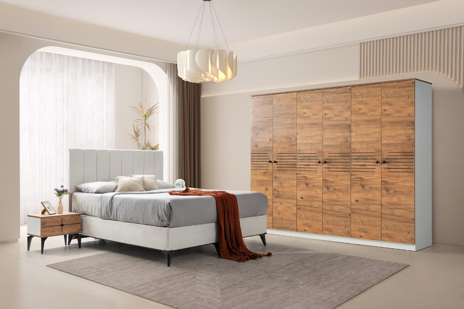 Bohem yatak odası modelimiz evinize tarz katacak trend üründür 6 kapı gardrop mdf lake boyalı 230x220cm 54 derinlik ölçülerine sahip kullanışlı bir dolaptır yeni model şifoniyer ve iki adet komidin 160 x200 başlık baza ve ultra ortapedik yatak kredi kartına ℅20;farkla taksit imkanı