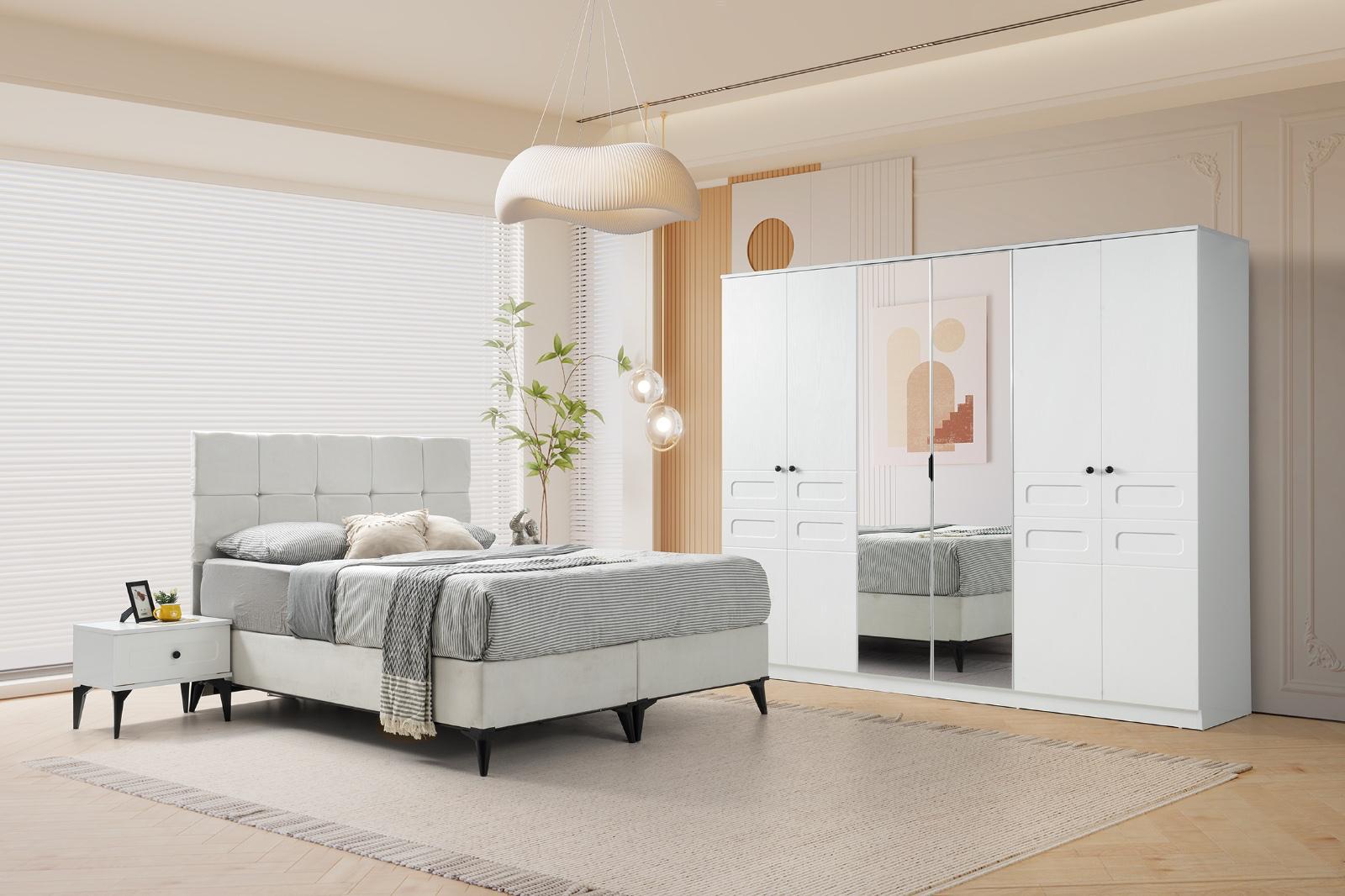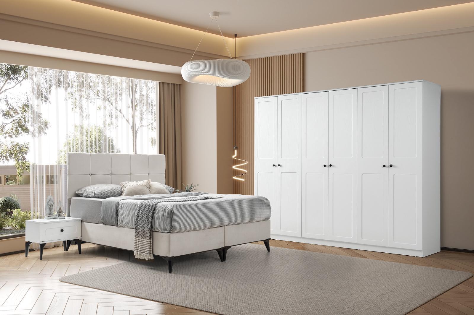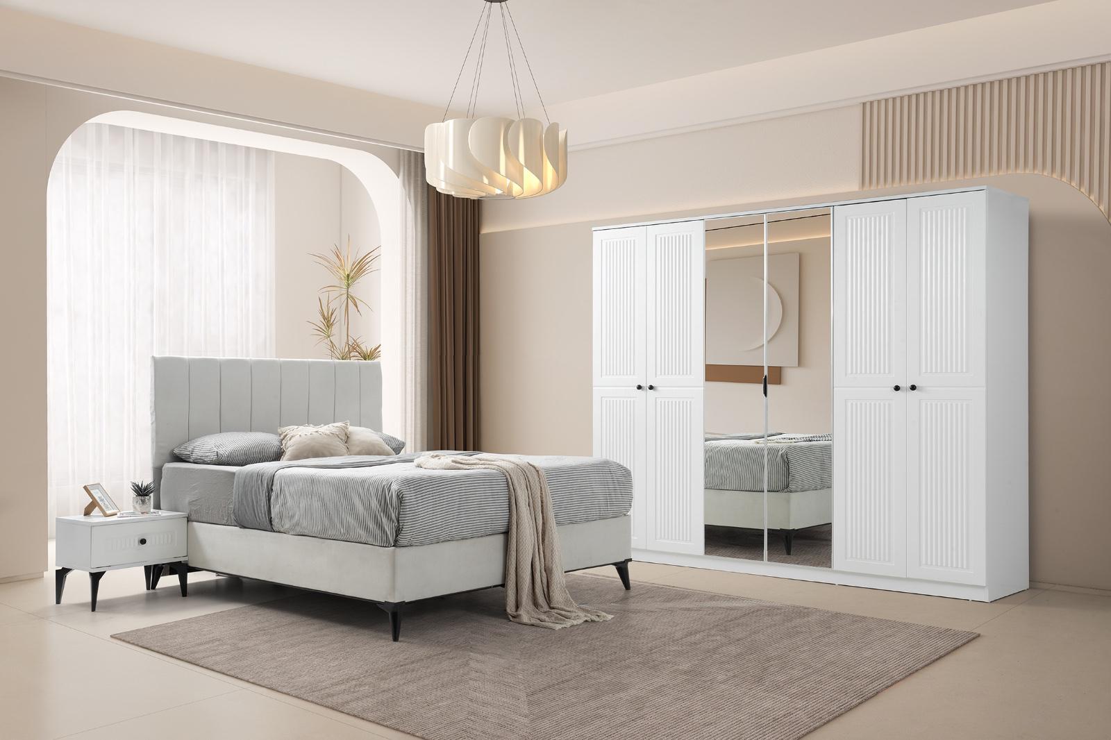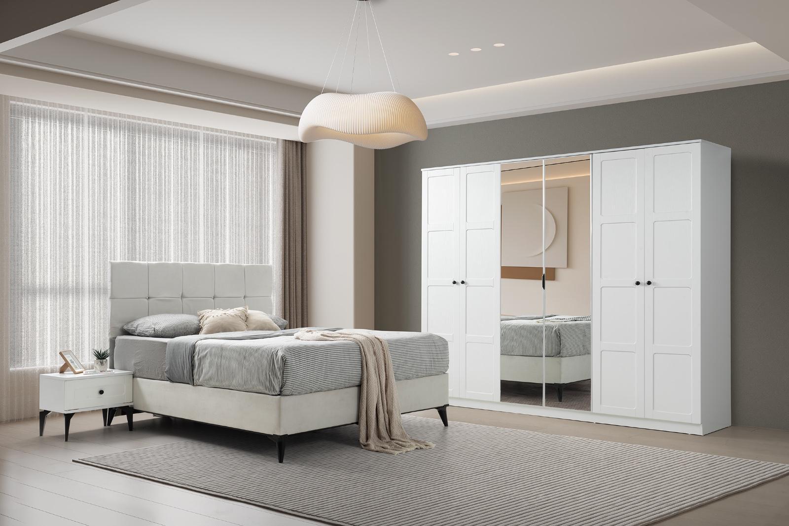 Bohem yatak odası modelimiz evinize tarz katacak trend üründür 6 kapı gardrop mdf lake boyalı 230x220cm 54 derinlik ölçülerine sahip kullanışlı bir dolaptır yeni model şifoniyer ve iki adet komidin 160 x200 başlık baza ve ultra ortapedik yatak kredi kartına ℅20;farkla taksit imkanı